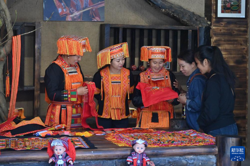 10月23日,游客在梧(wu)州市蒙山縣(xian)長坪瑤族(zu)鄉民族(zu)文化體驗基地參觀瑤族(zu)刺繡(xiu)。