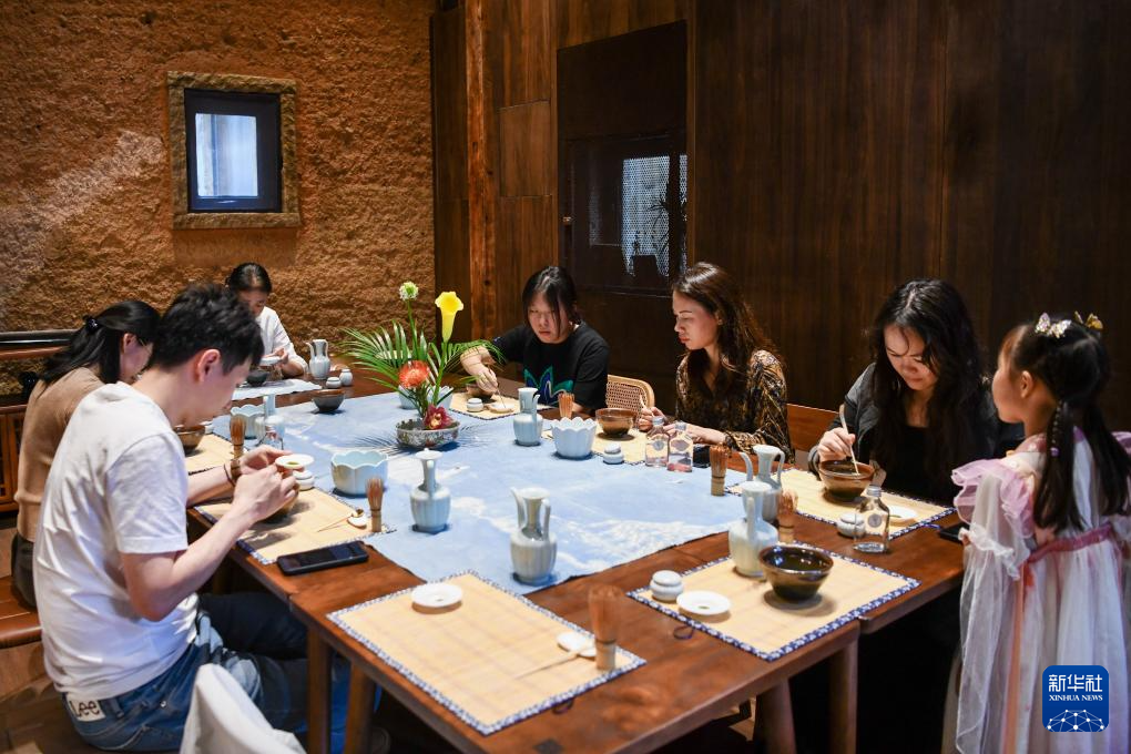 游客在長守戲劇谷里體驗制作(zuo)抹茶(11月9日攝)。