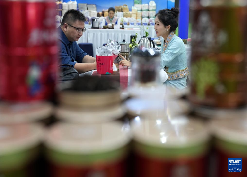 11月(yue)14日,一(yi)家參展商的工作(zuo)人員(右(you))在杭州秋季茶(cha)博會上向來賓推介茶(cha)葉(xie)。