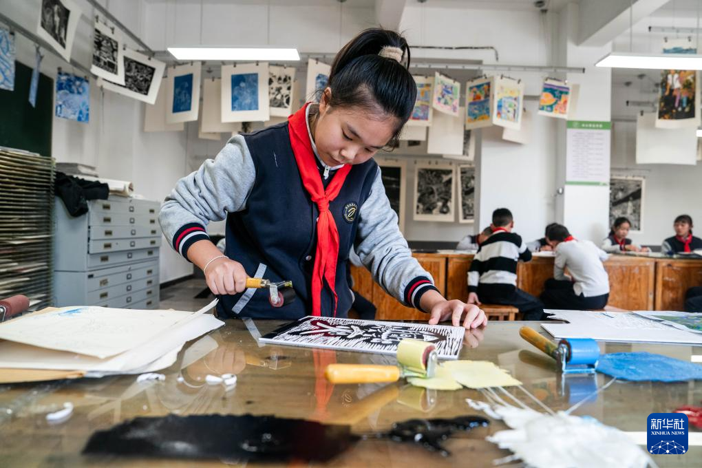 11月12日,曲靖市第(di)二小學(xue)的學(xue)生(sheng)在(zai)創作當地(di)特色的爨文化版畫作品。