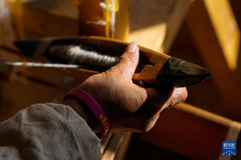 占珠站在(zai)(zai)老(lao)式(shi)織機旁(11月(yue)3日(ri)(ri)攝)。在(zai)(zai)四川省甘孜(zi)藏族(zu)自(zi)治州(zhou)(zhou)德格縣麥(mai)宿(su)鎮,娜(na)(na)葉家(jia)族(zu)中的(de)(de)女性以精湛的(de)(de)編(bian)織技藝(yi)(yi)著稱。她們利用牦牛絨、羊(yang)絨等(deng)物編(bian)織出優質的(de)(de)氆氌等(deng)紡織品,深受當地(di)居(ju)民喜愛。占珠于(yu)1960年出生于(yu)麥(mai)宿(su),是娜(na)(na)葉家(jia)族(zu)編(bian)織工(gong)藝(yi)(yi)的(de)(de)繼承者和發揚者,是非遺項目“藏族(zu)牛羊(yang)毛編(bian)織技藝(yi)(yi)”四川省甘孜(zi)州(zhou)(zhou)代表性傳(chuan)承人。在(zai)(zai)女兒扎西曲措的(de)(de)幫(bang)助(zhu)下,娜(na)(na)葉編(bian)織工(gong)坊(fang)的(de)(de)產品日(ri)(ri)益豐富,在(zai)(zai)傳(chuan)承家(jia)族(zu)古老(lao)技藝(yi)(yi)的(de)(de)同時,帶動周(zhou)邊鄉(xiang)親共同致富。