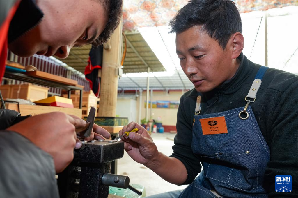 在(zai)2024年德格縣(xian)“善(shan)地文創手(shou)藝(yi)人”特色勞務品(pin)(pin)(pin)牌培訓班上,達瓦扎(zha)巴(ba)(右)指導一(yi)名當地學(xue)徒用傳統(tong)銀包(bao)銅工(gong)(gong)藝(yi)制(zhi)作文創產品(pin)(pin)(pin)(11月(yue)3日攝)。達瓦扎(zha)巴(ba)1992年出生(sheng)在(zai)四川省甘(gan)孜藏(zang)族(zu)(zu)(zu)(zu)自治州(zhou)德格縣(xian)麥宿鎮(zhen)一(yi)個手(shou)工(gong)(gong)藝(yi)家(jia)庭(ting),其家(jia)族(zu)(zu)(zu)(zu)有約兩百(bai)年制(zhi)作利瑪銅鑄制(zhi)品(pin)(pin)(pin)的歷(li)史。達瓦扎(zha)巴(ba)從小跟隨父親尼瑪學(xue)習。如今,他已是非遺項(xiang)目“藏(zang)族(zu)(zu)(zu)(zu)金屬鍛造技藝(yi)”四川省甘(gan)孜州(zhou)代表性傳承人。達瓦扎(zha)巴(ba)在(zai)繼承傳統(tong)工(gong)(gong)藝(yi)的同時(shi),開發創作時(shi)尚文創產品(pin)(pin)(pin),將藏(zang)族(zu)(zu)(zu)(zu)傳統(tong)手(shou)工(gong)(gong)藝(yi)推(tui)向國際市(shi)場。目前,其家(jia)族(zu)(zu)(zu)(zu)的“欽樂工(gong)(gong)坊(fang)”有全(quan)職(zhi)手(shou)藝(yi)人約40名。