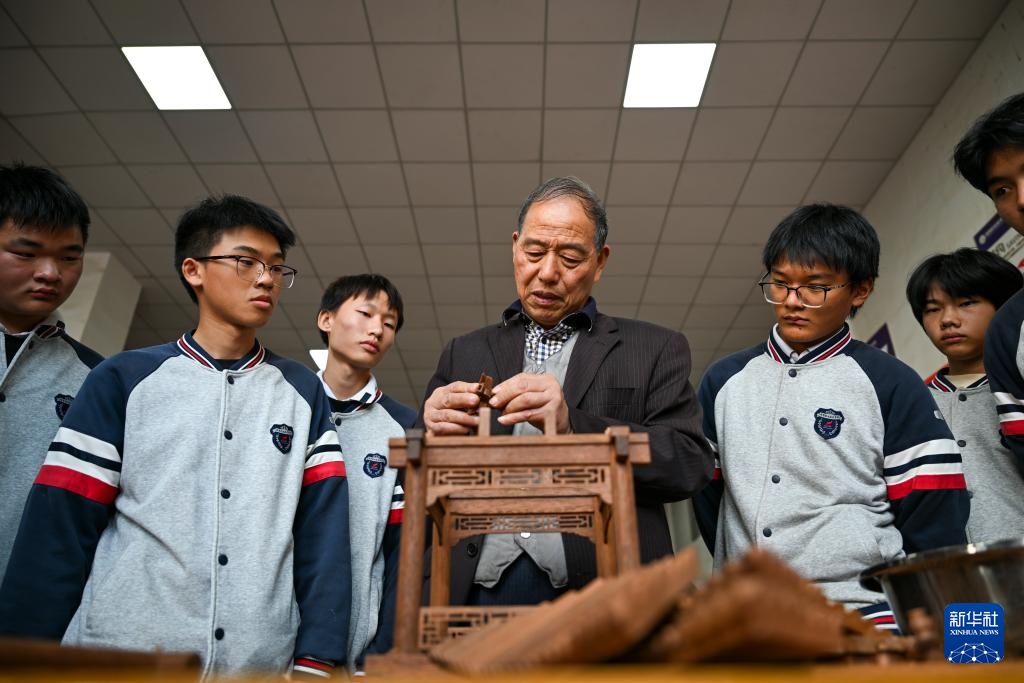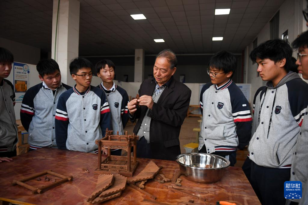11月22日(ri),在臨海(hai)市(shi)海(hai)商職業技術學校,黃(huang)大樹(中)為學生進行(xing)涼(liang)亭拼裝演示(shi)。