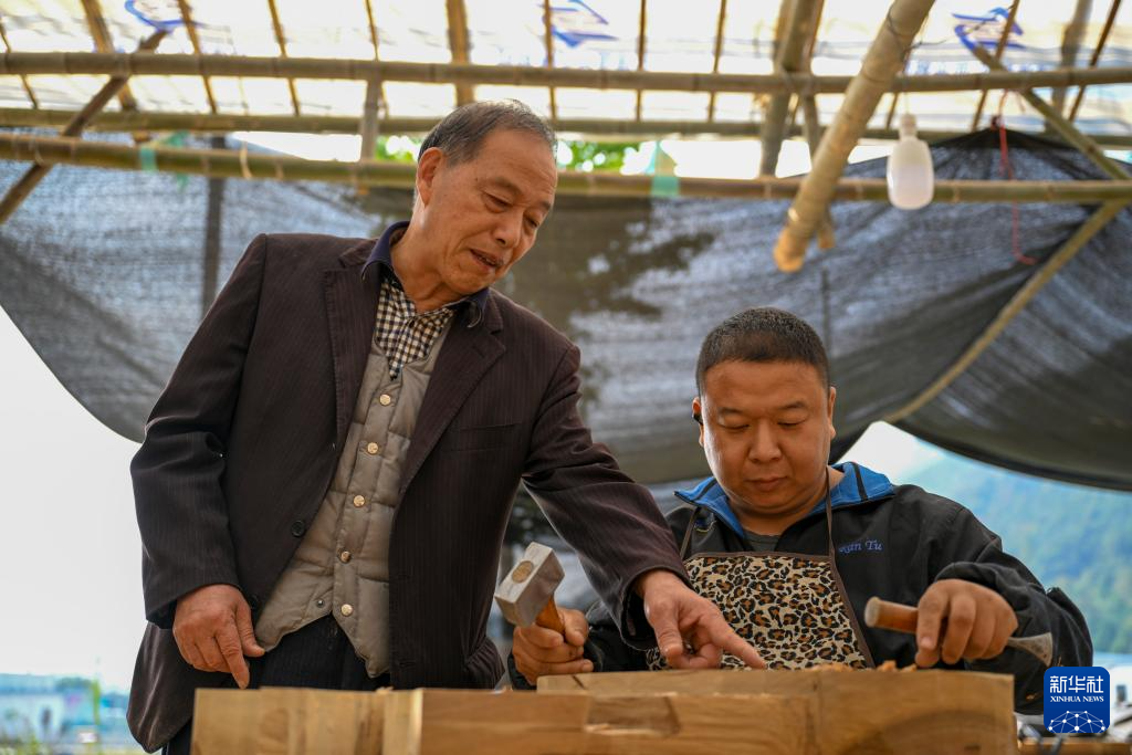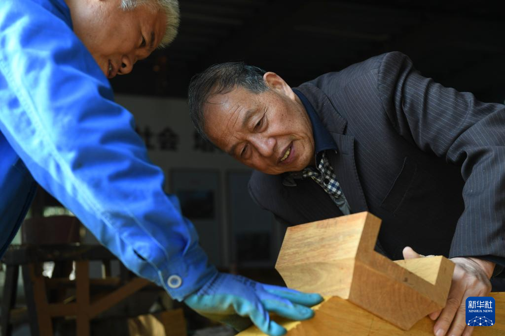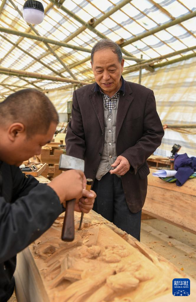 11月22日(ri),在(zai)浙(zhe)江臨(lin)海匯(hui)溪鎮浚頭村,黃大樹(右)指導當地(di)工(gong)匠雕刻梁上(shang)的故事畫(hua)。