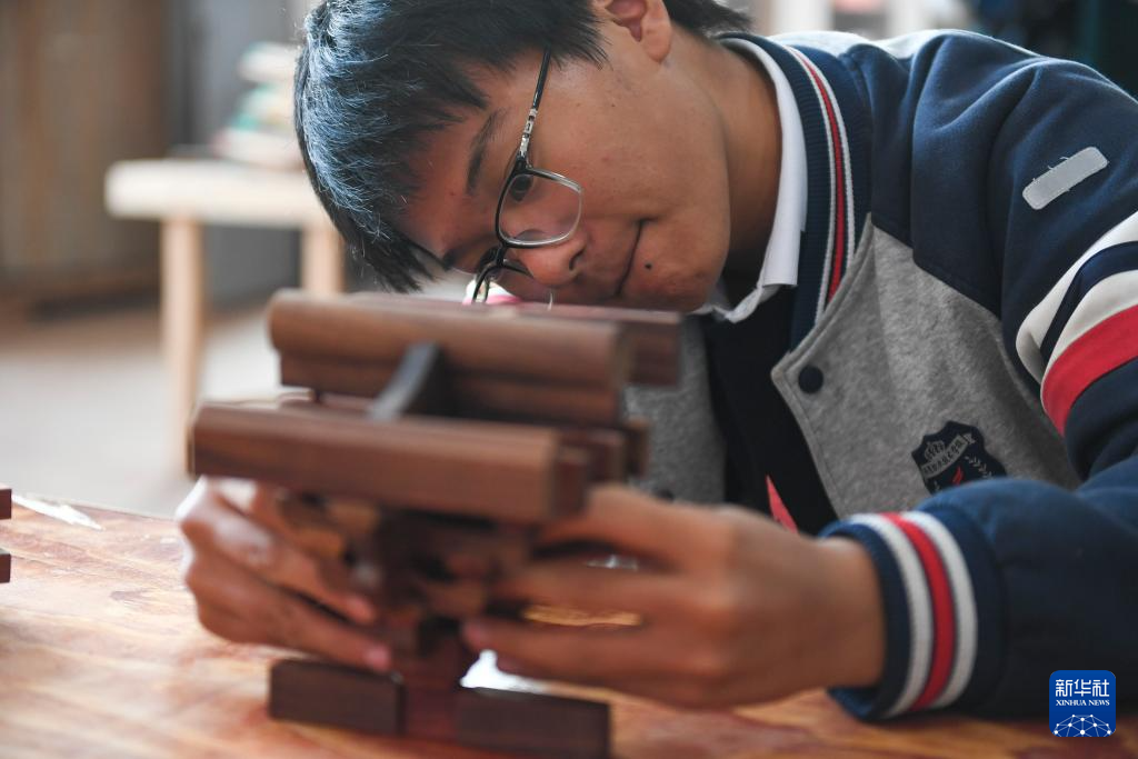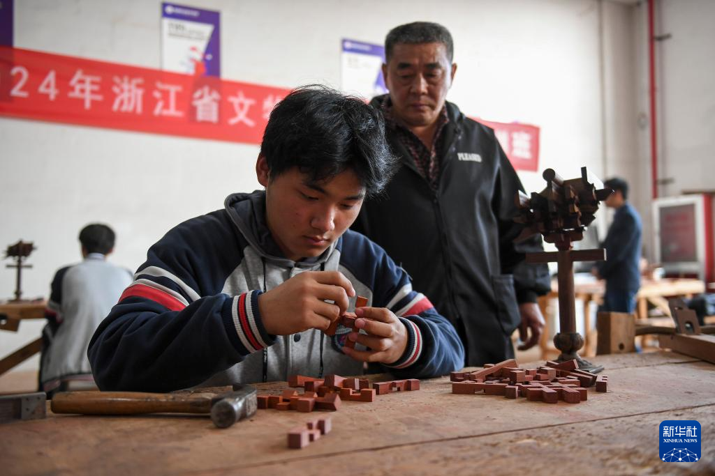 11月22日,在(zai)臨海市海商(shang)職業技術(shu)學(xue)校,學(xue)生在(zai)資深(shen)工(gong)匠的指導下(xia)學(xue)習(xi)制作魯班鎖(suo)。