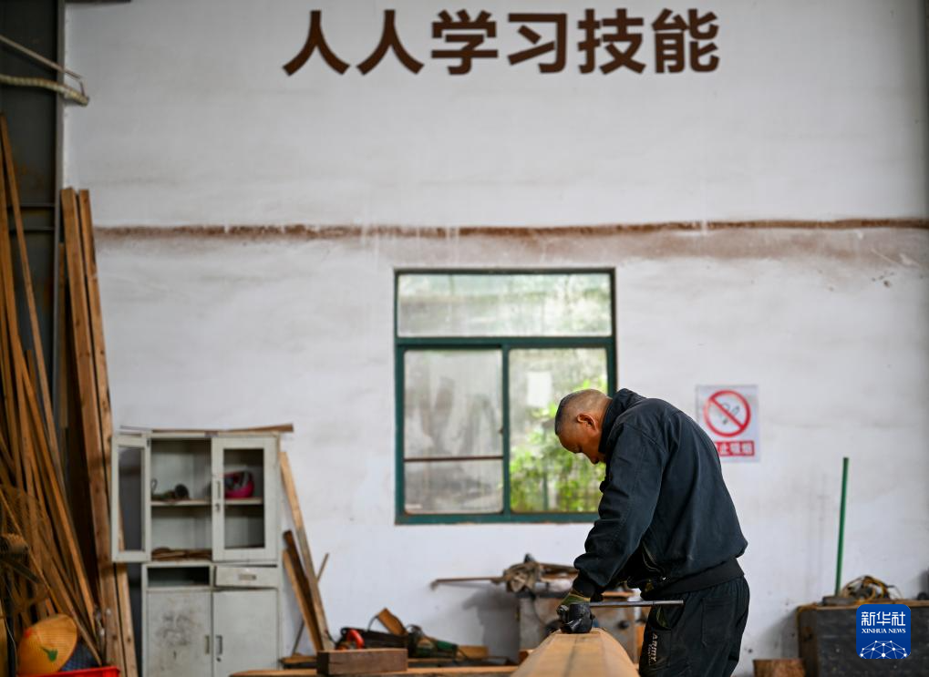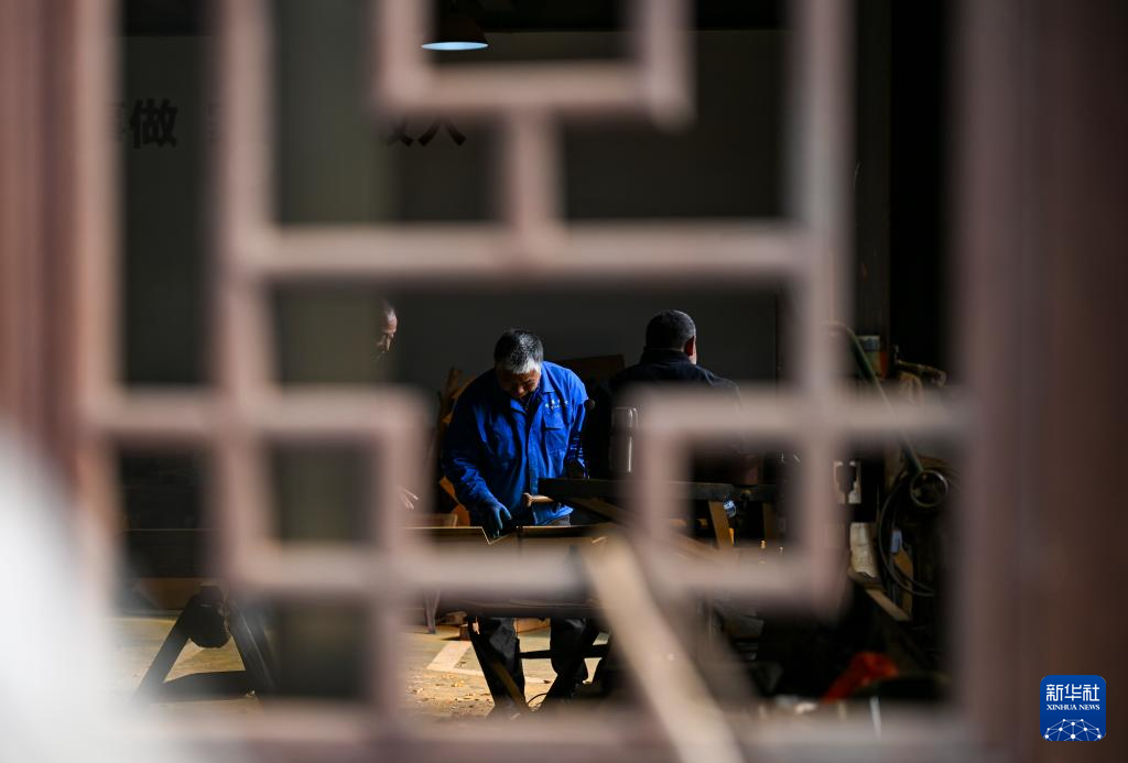 11月22日,在(zai)“古(gu)建共富工(gong)坊”,木工(gong)師(shi)傅在(zai)給木材劃線(xian)。