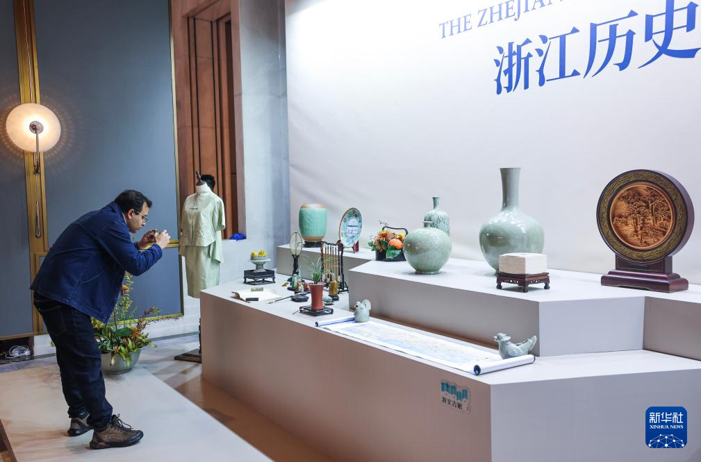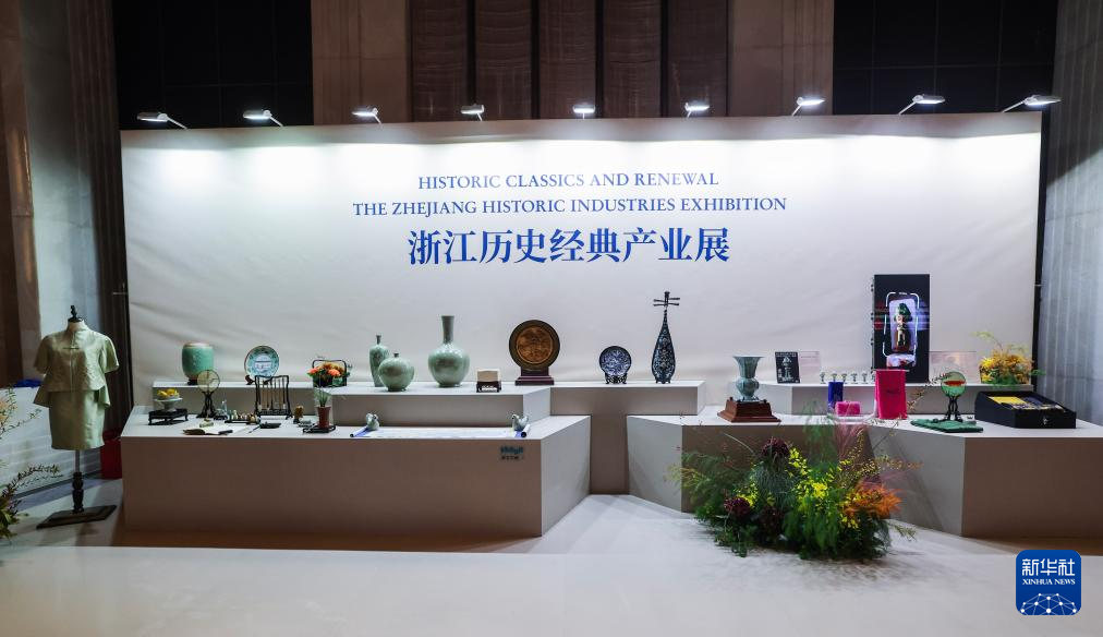這是11月(yue)25日拍攝的浙(zhe)江歷史經典產業展臺上(shang)展示的浙(zhe)江特色產業名品和大師作品。