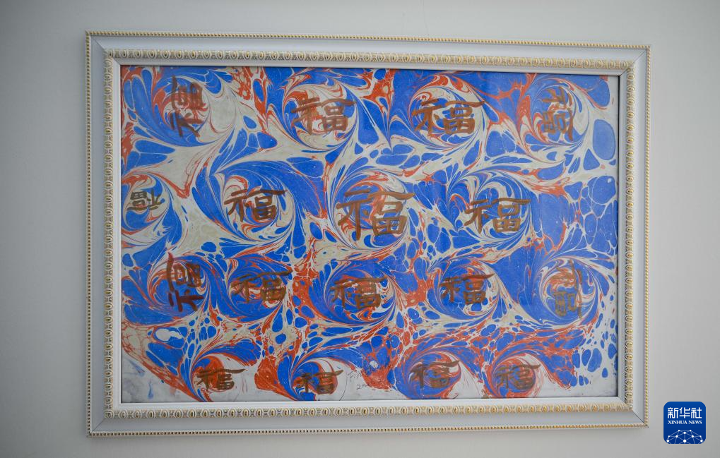 這是11月5日在李昕(xin)桐位于(yu)土耳其(qi)伊斯坦布(bu)爾的(de)家(jia)中(zhong)拍攝的(de)繪有“福”字的(de)水拓畫(hua)。