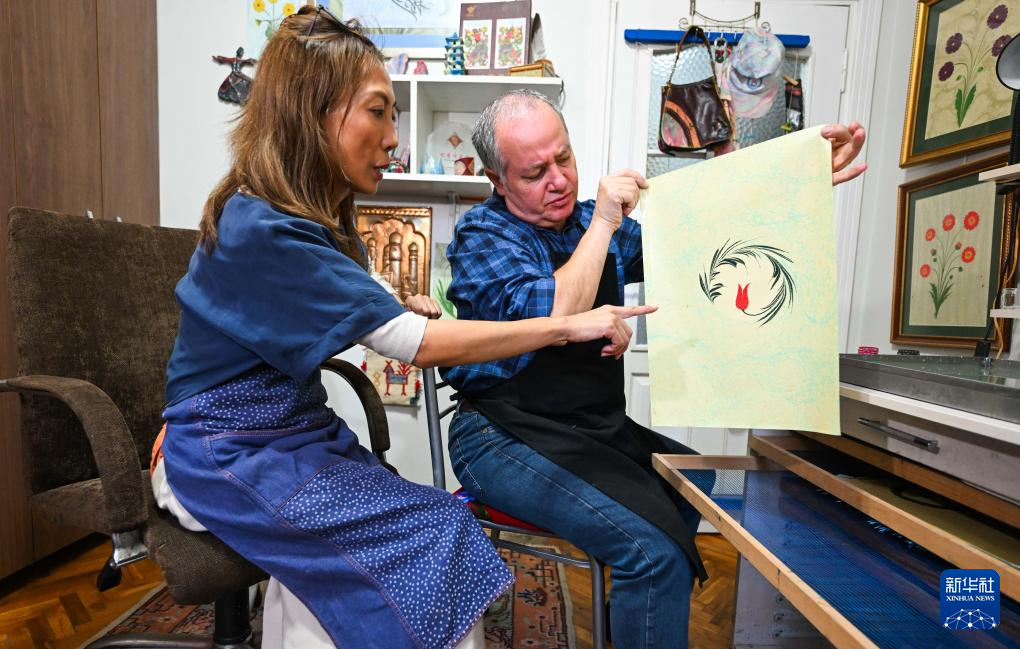 11月1日,在土耳其伊斯坦布爾(er),李昕桐(右)跟隨老師(shi)埃羅(luo)爾(er)練習繪制水拓畫。