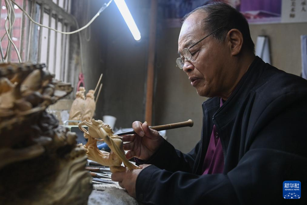 虞(yu)金順(shun)在工作室(shi)雕刻一件樂(le)清黃楊木雕作品(11月(yue)25日攝(she))。