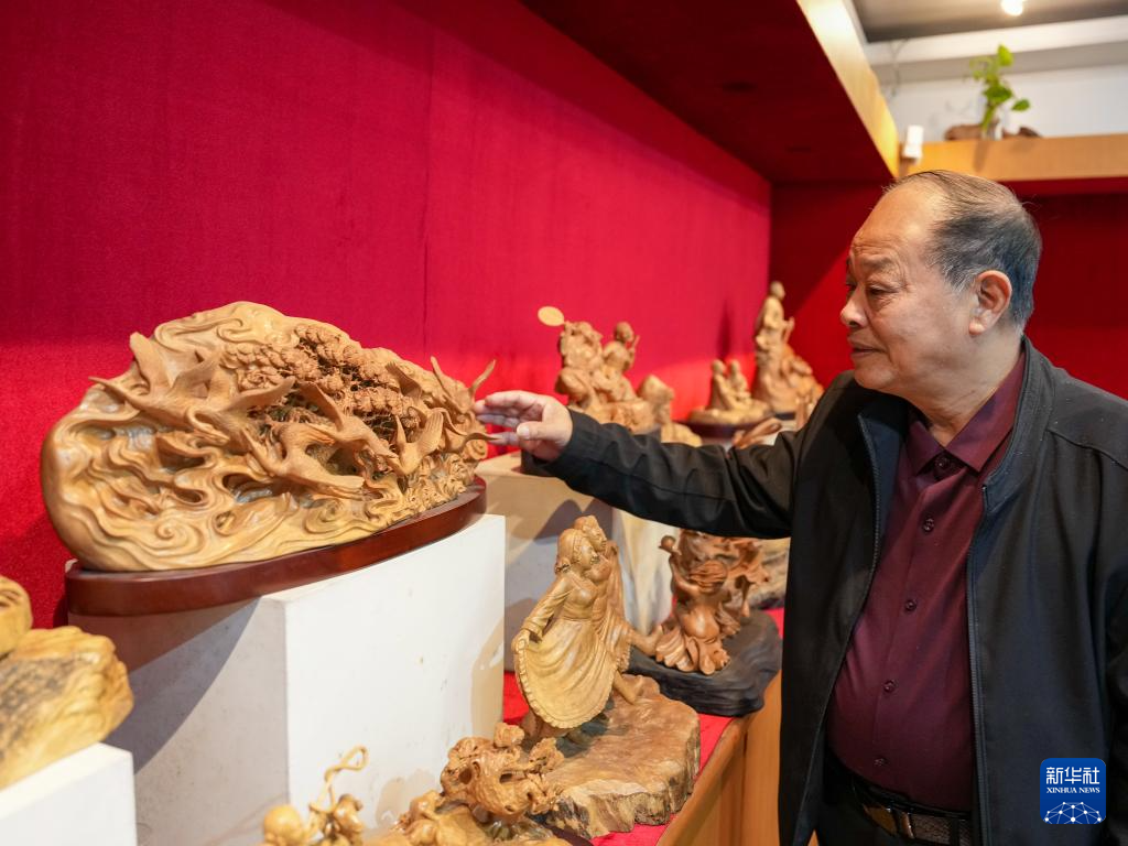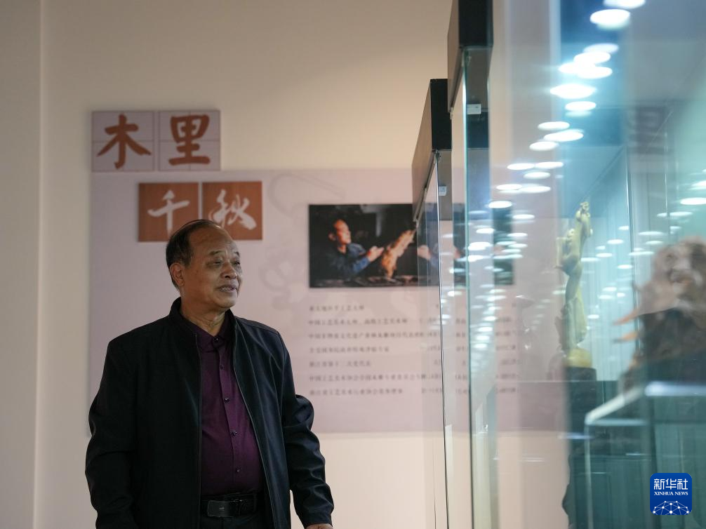虞金順在工作室展示自己創作的樂清黃(huang)楊木雕作品(pin)(11月(yue)25日攝)。
