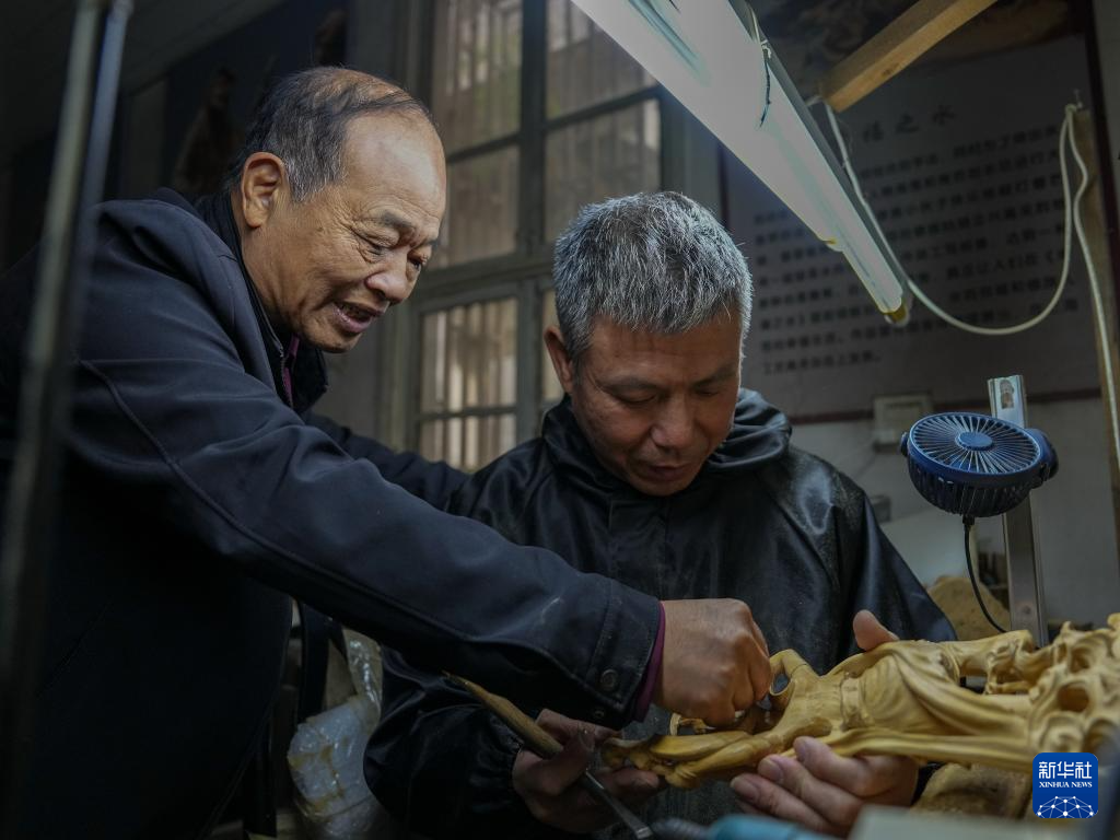 虞金順(左)在工作室指導(dao)學生李(li)毅雕刻(ke)(11月25日攝)。