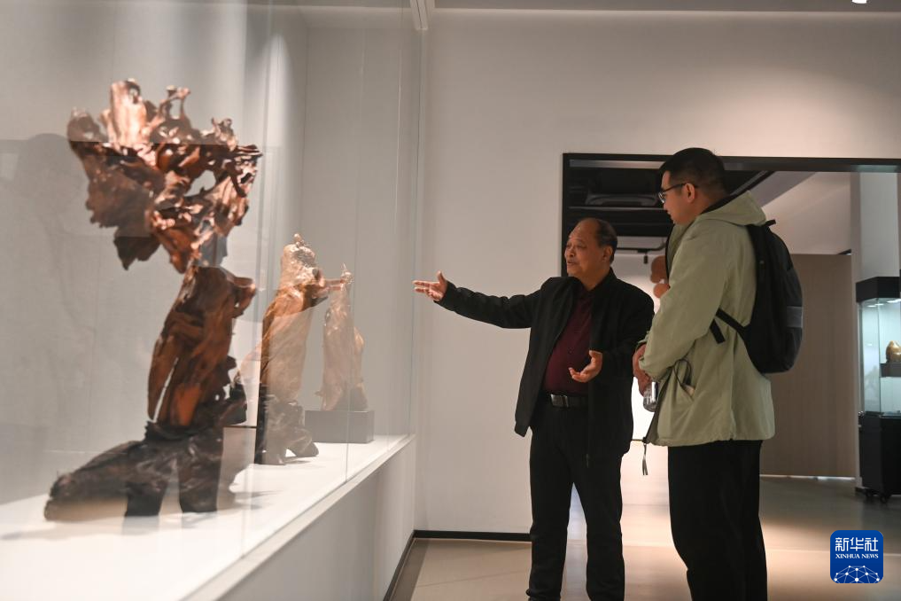 虞(yu)金順(左(zuo))在藝(yi)術館(guan)展示介紹自己創作的樂清黃楊木雕作品(11月25日攝)。