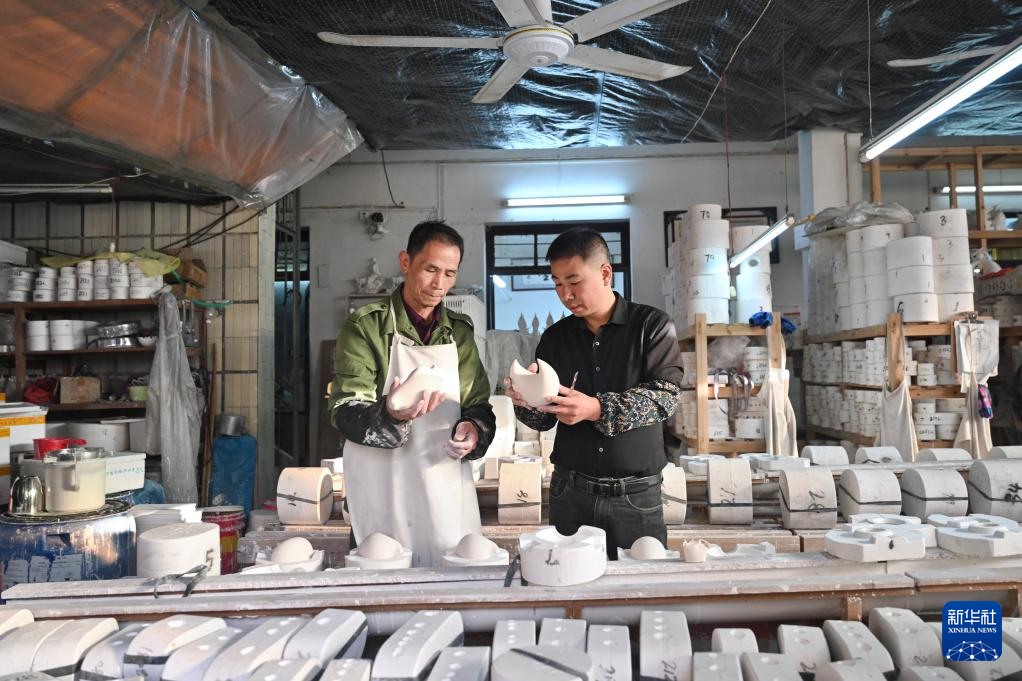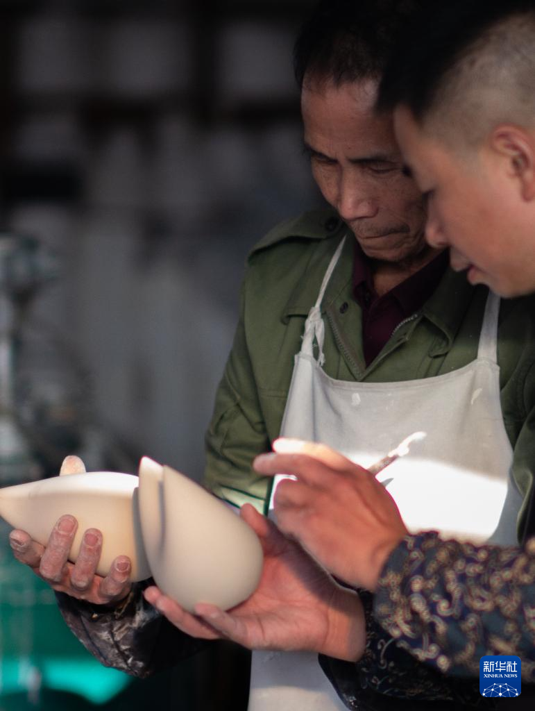12月6日,彭成雄在(zai)位于福建省(sheng)泉州市德化縣的工(gong)作室內與父親(qin)一起(qi)查看陶瓷坯體。