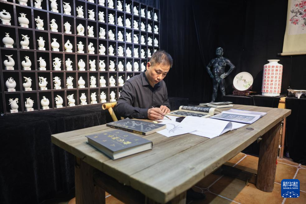 這是(shi)在福建省(sheng)泉州市(shi)德化縣彭成雄(xiong)工作(zuo)室內拍攝的陶瓷作(zuo)品(拼版照片(pian),12月(yue)6日攝)。