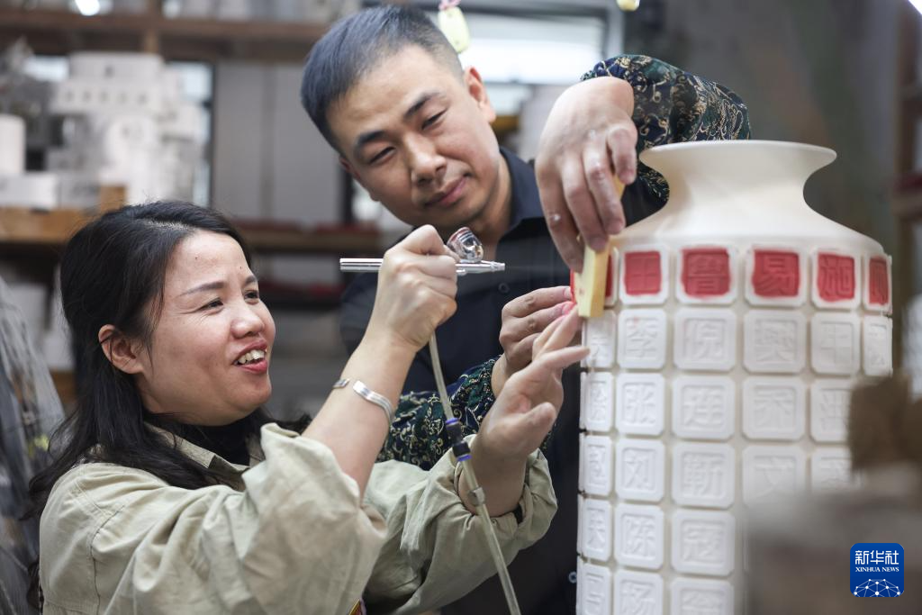 12月6日,彭成雄與妻(qi)子(zi)鄭(zheng)寶(bao)珠在位于福建省(sheng)泉州市德化縣(xian)的(de)工作室內為陶瓷作品上(shang)色。