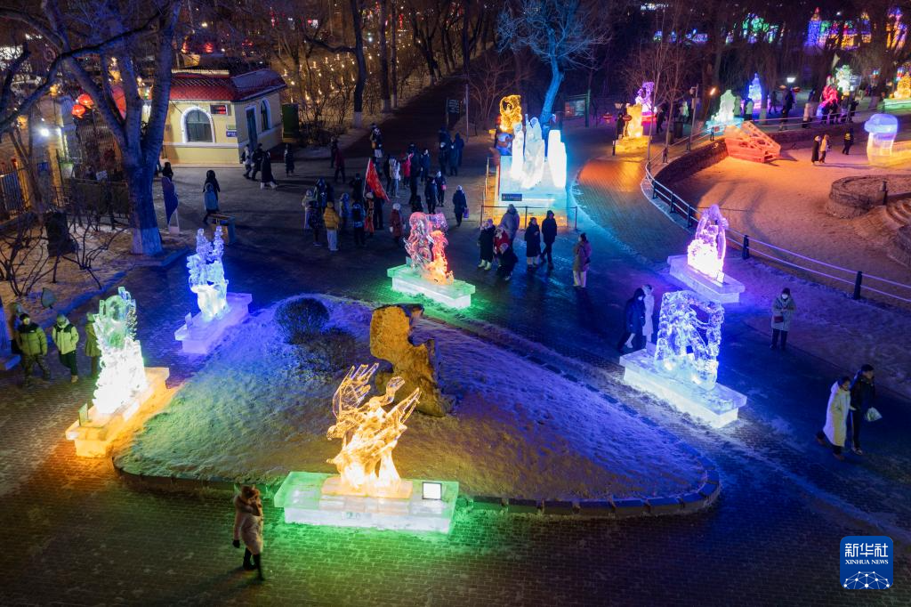 這是1月2日拍攝的位于哈爾濱市兆麟公園內的冰燈藝術游園會園區(無人機照片)。
