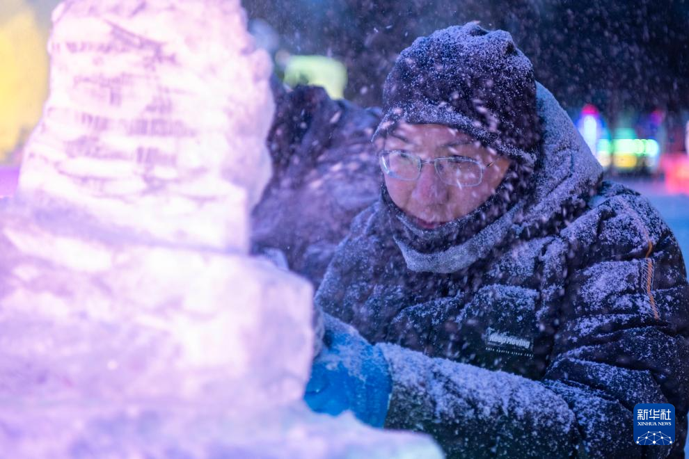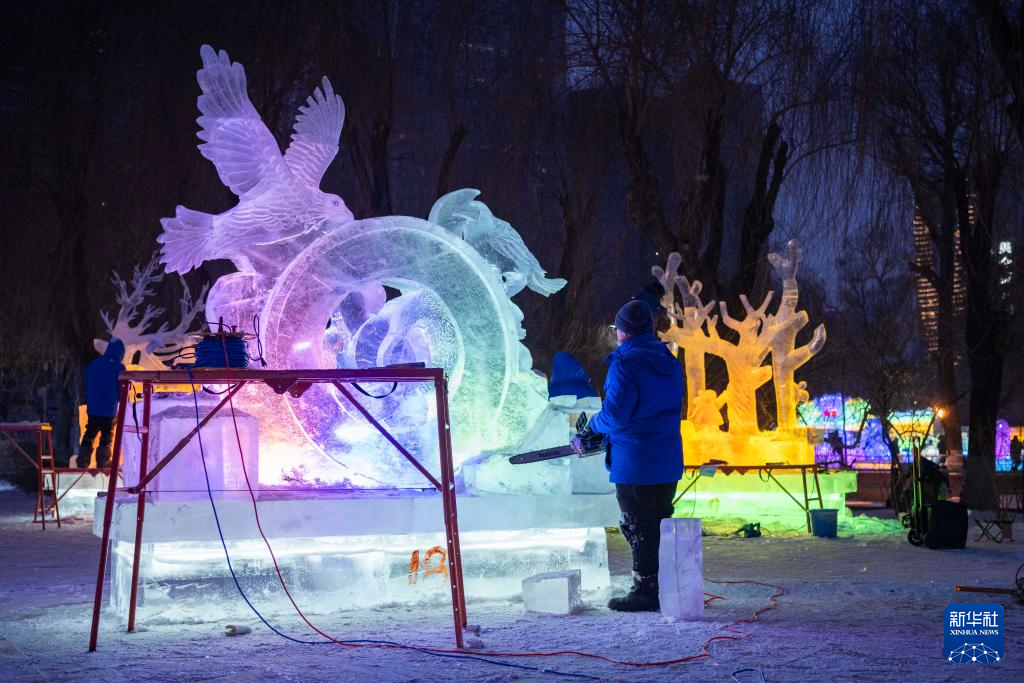 當日,在哈爾濱市兆麟公園舉行的第44屆全國專業冰雕比賽進入第2個比賽日,來自全國的冰雕師加緊創作冰雕作品。這些冰雕將作為公園冰雪景觀的一部分,為市民游客獻上一場冰雪藝術的視覺盛宴。
