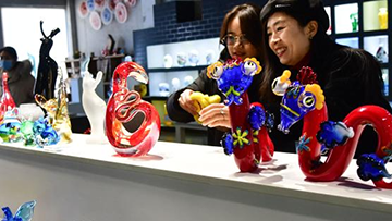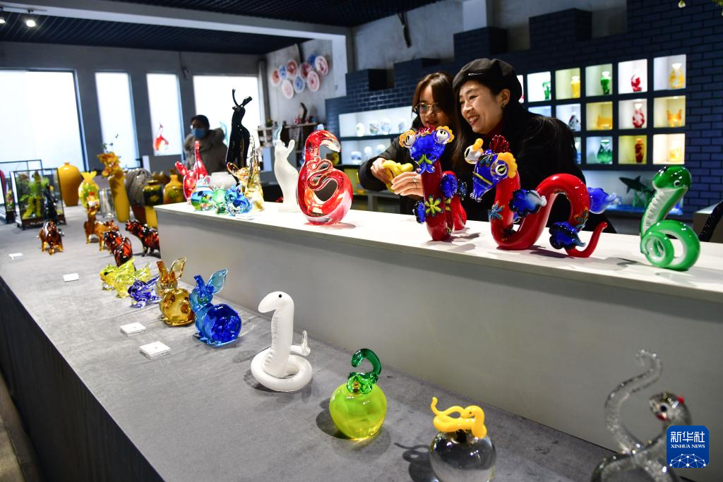 1月9日,消(xiao)費者在淄博市(shi)博山區西冶工坊展銷(xiao)廳內挑(tiao)選蛇年主題(ti)琉(liu)璃工藝品。