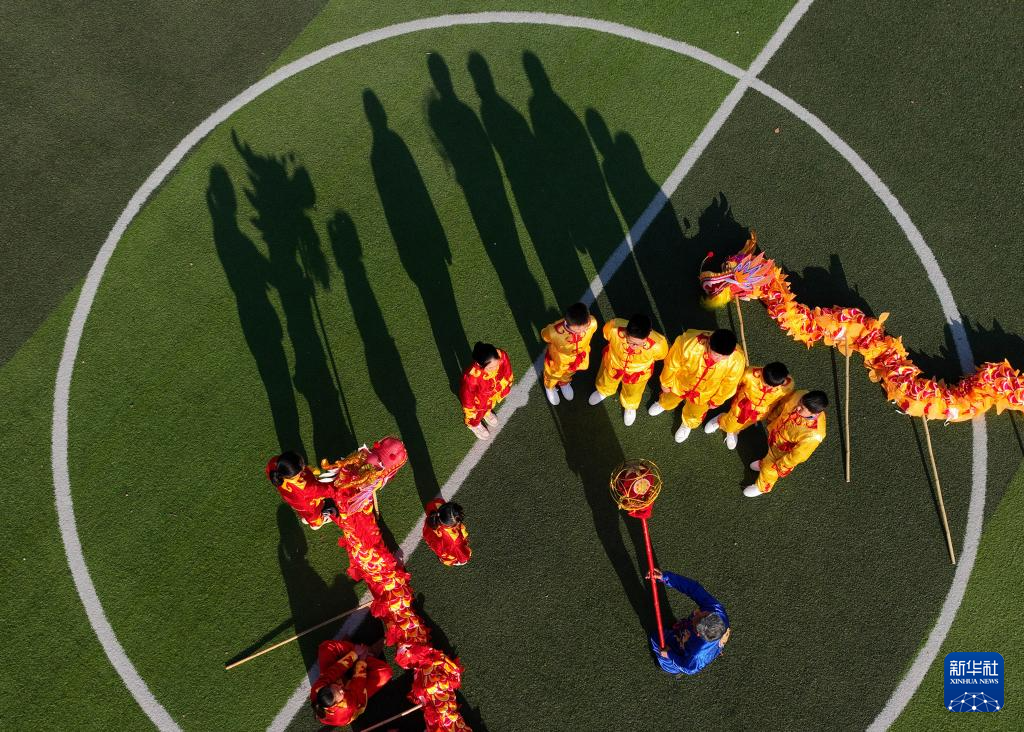 非遺傳(chuan)承人在江蘇鎮江句容市(shi)葛村中心小學輔導(dao)學生練(lian)習(xi)舞龍技藝(1月10日攝,無人機(ji)照片)。