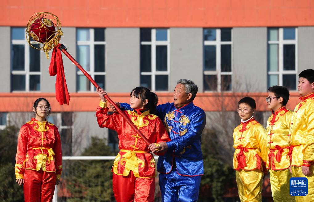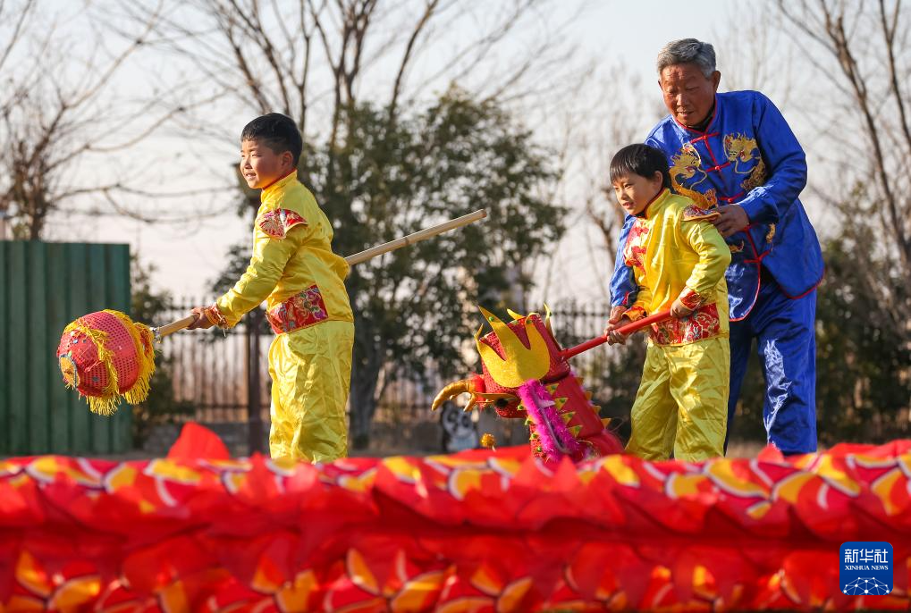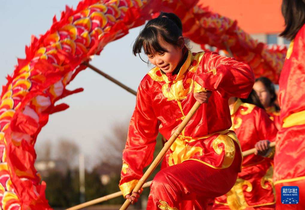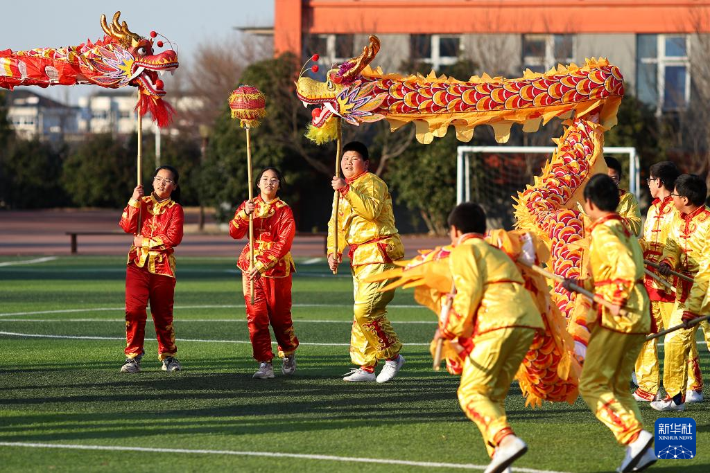 1月10日,非遺傳(chuan)承(cheng)人在江蘇(su)省鎮江句容市(shi)葛村中(zhong)心(xin)小學教授學生練(lian)習舞龍技藝,帶領(ling)孩子們感受傳(chuan)統(tong)文(wen)化魅力,迎接新(xin)春(chun)佳節。