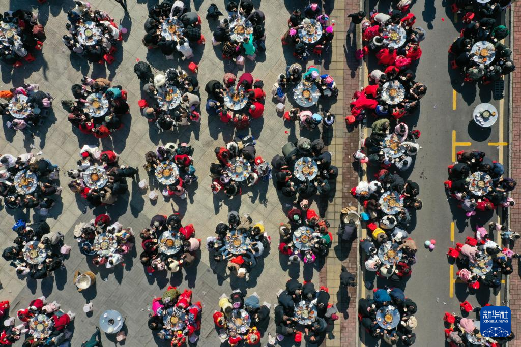 1月12日,群眾在(zai)貴(gui)州省黔南(nan)布依族(zu)苗族(zu)自治(zhi)州都(dou)勻市(shi)小圍寨街道思源社區(qu)一起(qi)吃團圓宴(無(wu)人機(ji)照片)。
