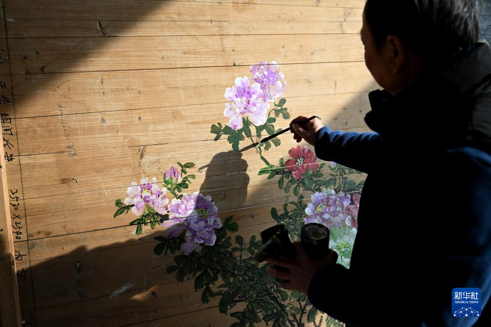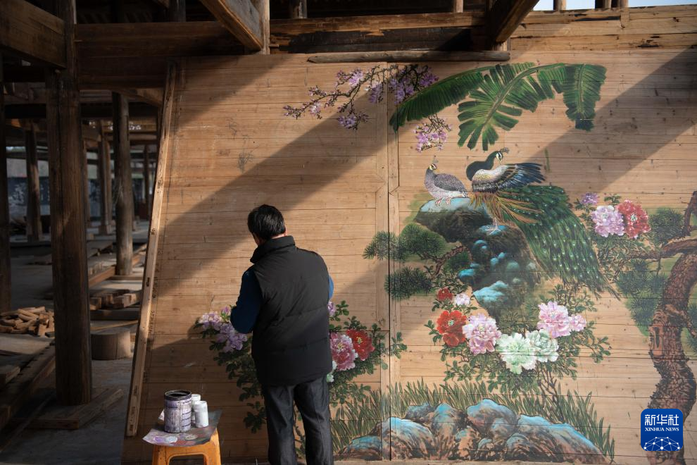 1月6日,在黃山徽匠園林古建有限公司(si)廠(chang)區(qu),工(gong)匠應中秋在徽派仿古建筑的構件上進(jin)行彩繪(hui)。