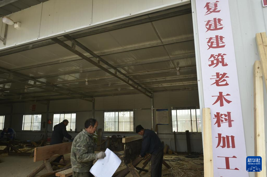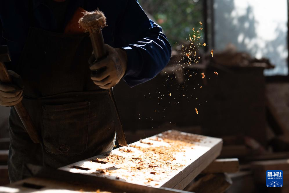 1月(yue)8日(ri),在(zai)安徽省(sheng)黃(huang)山市休寧縣,工人在(zai)一處傳統徽派古民居復建工地現場進行木料加(jia)工。