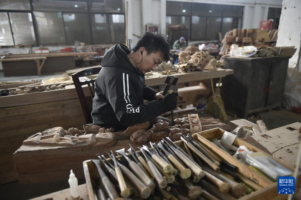 1月6日,工(gong)匠在黃山徽匠園林古建有(you)限公司(si)廠區雕刻徽派仿古建筑構件。