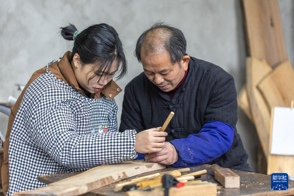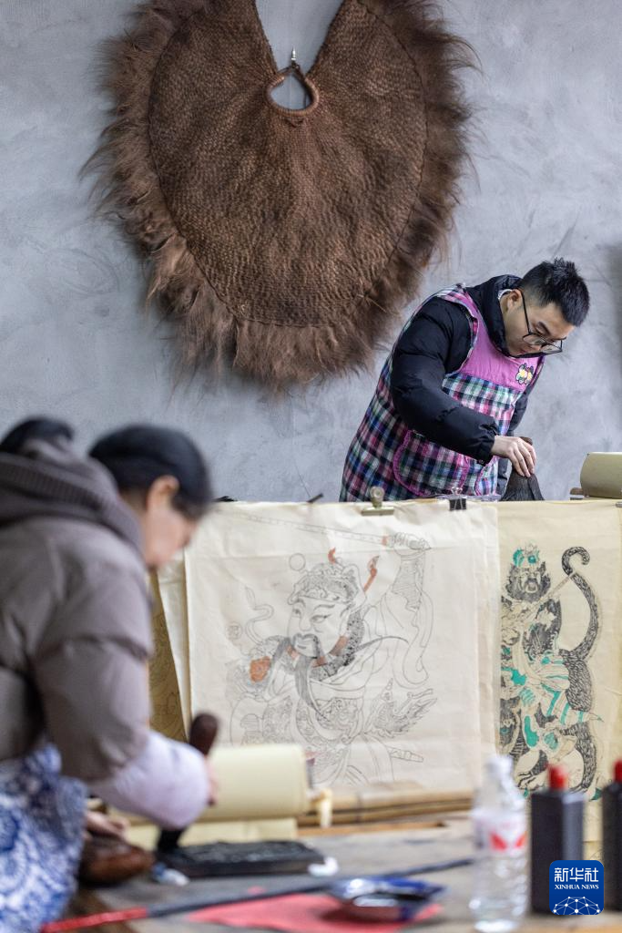 1月14日,在重慶市梁平(ping)區屏(ping)錦鎮,梁平(ping)木版年(nian)畫國家(jia)級代表性傳承人徐家(jia)輝(hui)(右(you))指導(dao)學生熊彩汝梁平(ping)木版年(nian)畫技藝。