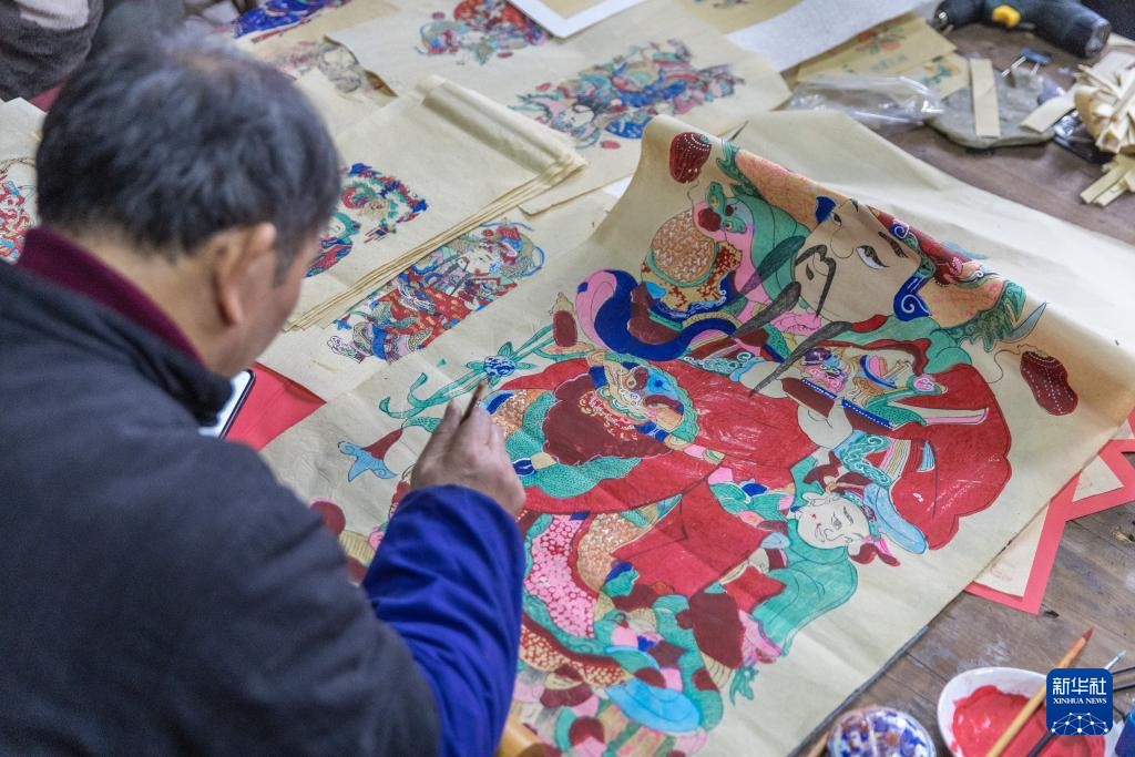 1月14日(ri),在重慶市(shi)梁平(ping)區屏錦鎮,梁平(ping)木(mu)版年畫國(guo)家級(ji)代表性傳承人徐家輝在工作室內為年畫描色。
