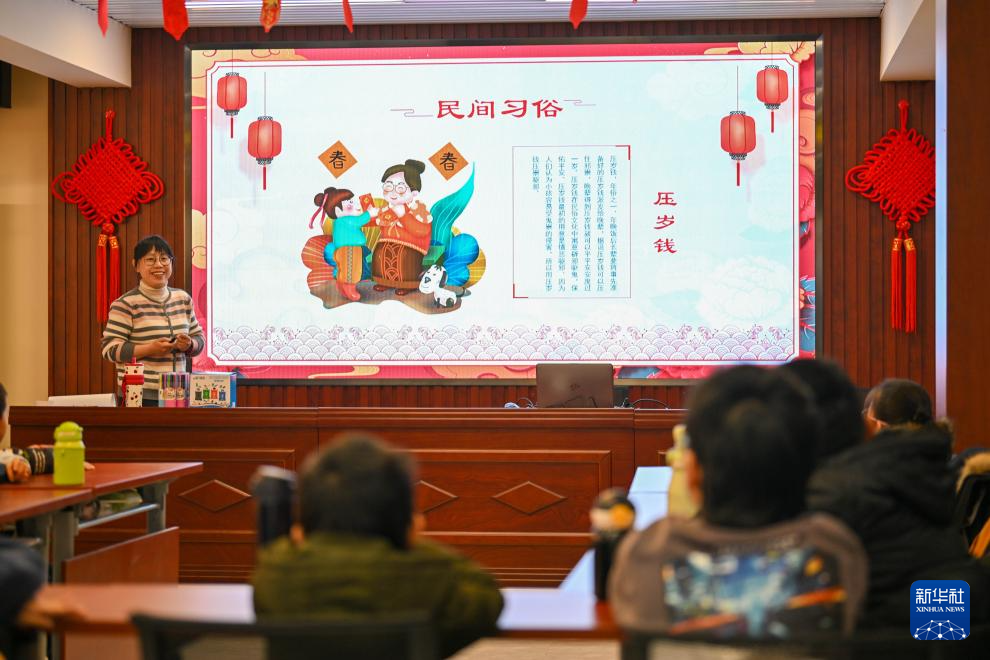 1月16日,在天(tian)津(jin)市河東區大王莊街道麟祥里(li)社(she)區活動室,社(she)區志愿者(zhe)帶領小朋友(you)了解春節民(min)俗。