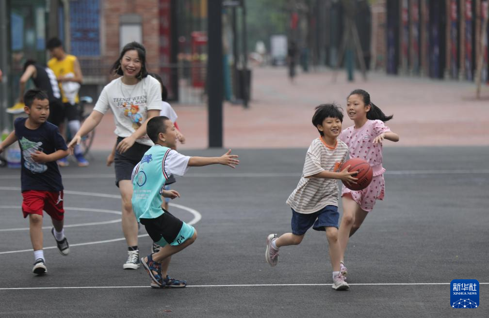 小朋友們在遼寧(ning)省沈陽市紅梅文創(chuang)園(yuan)的籃球(qiu)場打籃球(qiu)(2021年(nian)7月7日(ri)攝)。