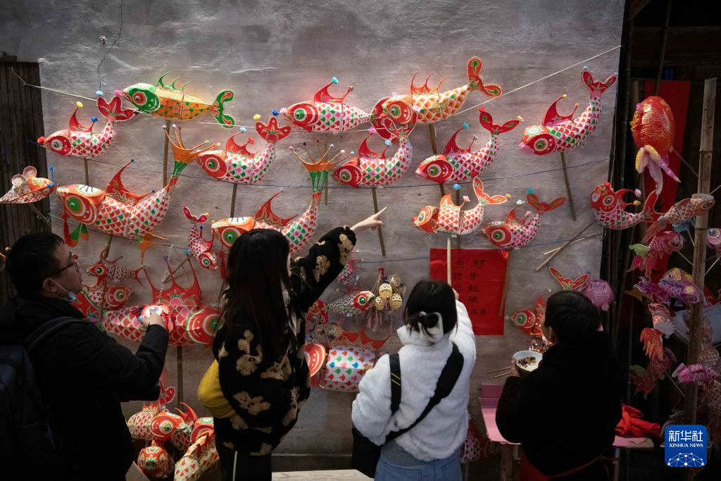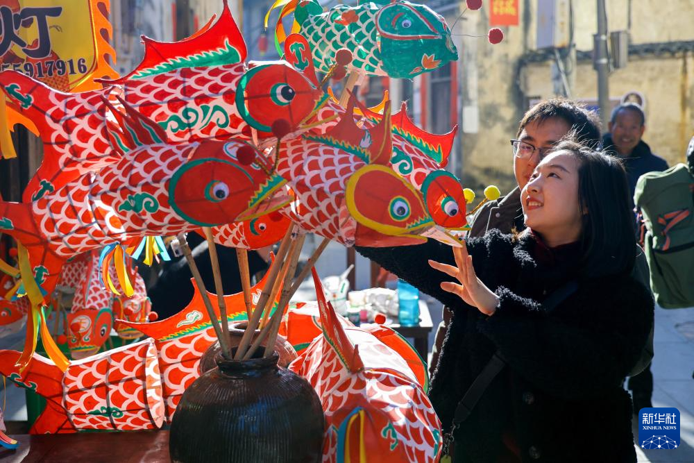 1月10日,在(zai)安徽省黃山市歙縣北岸鎮瞻淇村,游(you)客在(zai)選(xuan)購魚(yu)燈。