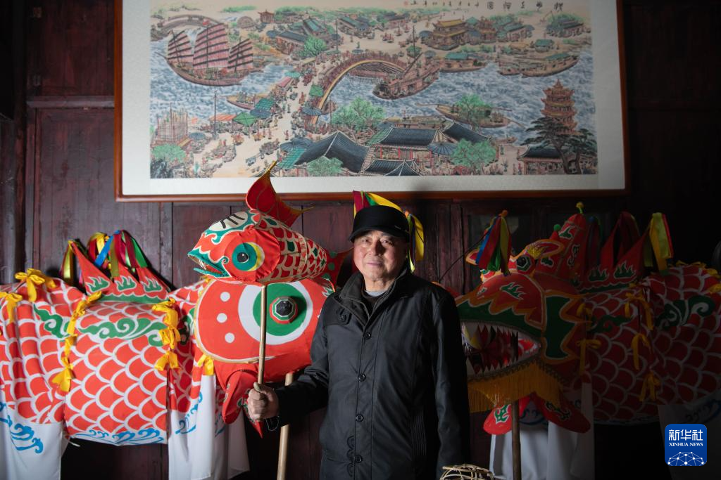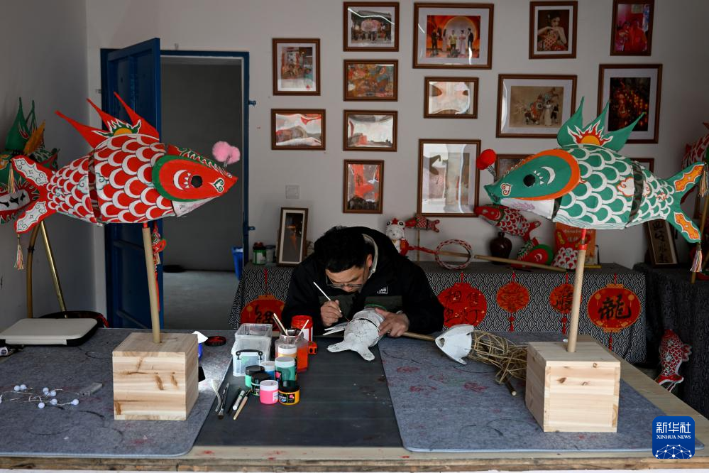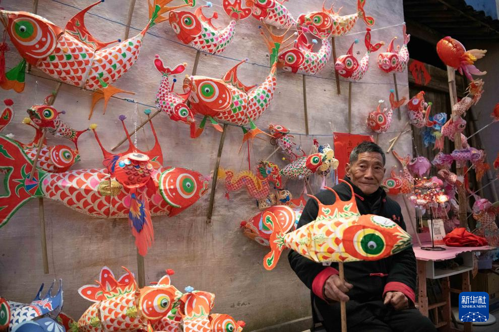 1月6日,在(zai)安徽省黃山市歙縣北岸(an)鎮(zhen)瞻淇(qi)村,瞻淇(qi)魚燈非遺傳承人汪觀(guan)海(hai)在(zai)家中展(zhan)示自己制作(zuo)的魚燈。