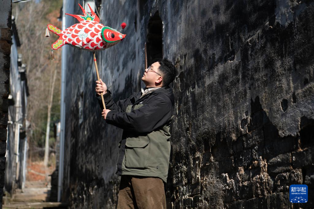 1月6日,在安徽(hui)省黃山市歙縣北岸鎮瞻淇村,瞻淇魚(yu)(yu)燈(deng)非遺傳承(cheng)人汪宇(yu)昉展示自己(ji)制(zhi)作的魚(yu)(yu)燈(deng)。