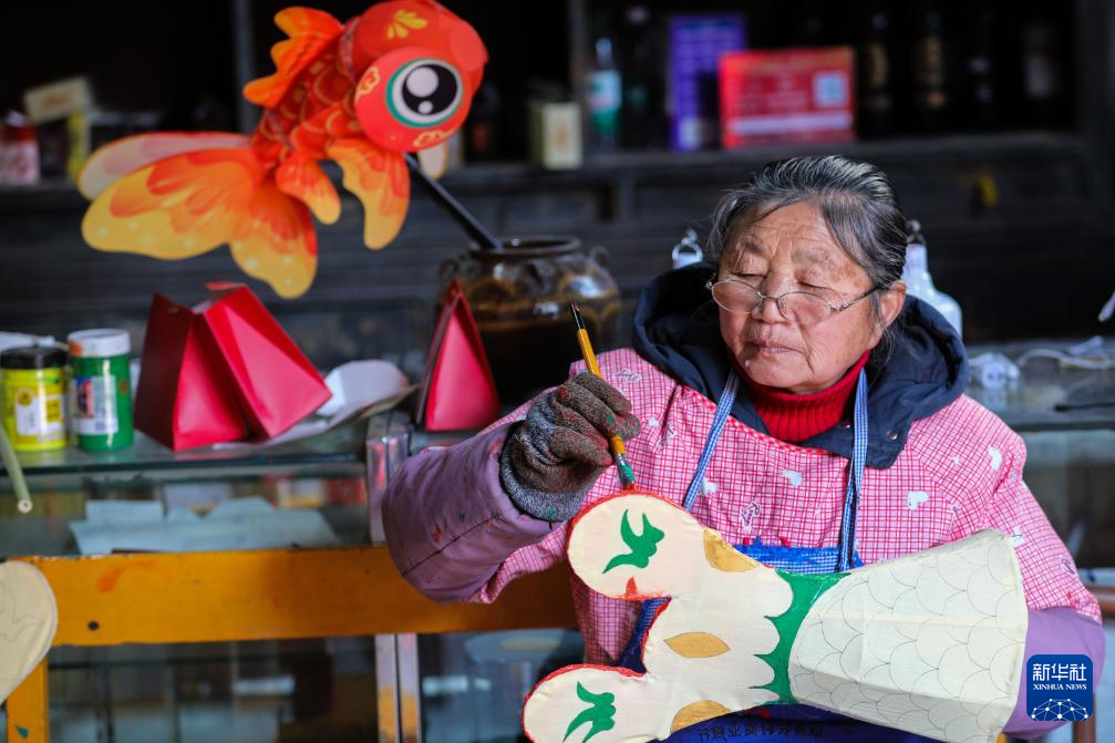 1月18日,在安徽省黃山市歙(she)縣北岸鎮瞻淇村,村民(min)汪文英在制作魚燈。