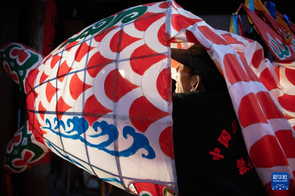 1月8日,在(zai)安徽省黃山市歙縣北(bei)岸鎮瞻(zhan)淇村一處祠堂里,村民點亮魚燈,準(zhun)備(bei)在(zai)村里舞燈。