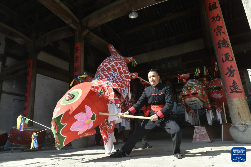 1月6日,安(an)徽省黃(huang)山市歙(she)縣北(bei)岸鎮瞻淇村魚燈(deng)隊隊長鄭冬蛟在(zai)演示舞魚燈(deng)。