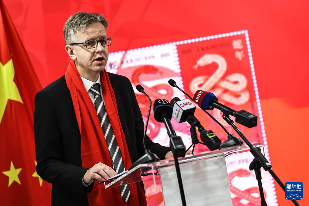 1月21日,匈牙利國(guo)家經濟部副國(guo)務(wu)秘書(shu)朗·蓋(gai)佐在布達佩斯(si)舉行的中(zhong)國(guo)農(nong)歷蛇年生肖郵票發行儀(yi)式(shi)上致辭。