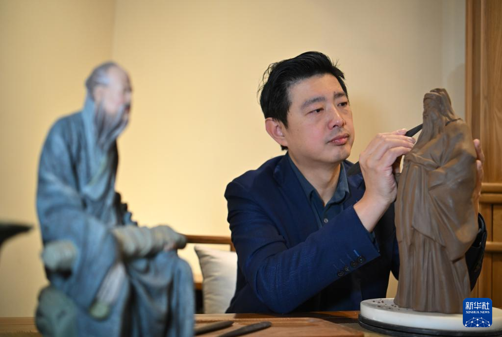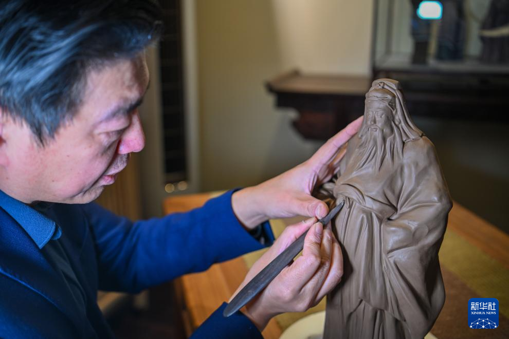 泥(ni)人(ren)張(zhang)第六(liu)代傳(chuan)承人(ren)張(zhang)宇在天津古文化街(jie)泥(ni)人(ren)張(zhang)美(mei)術館為新作品《福星》塑形(1月20日(ri)攝(she))。