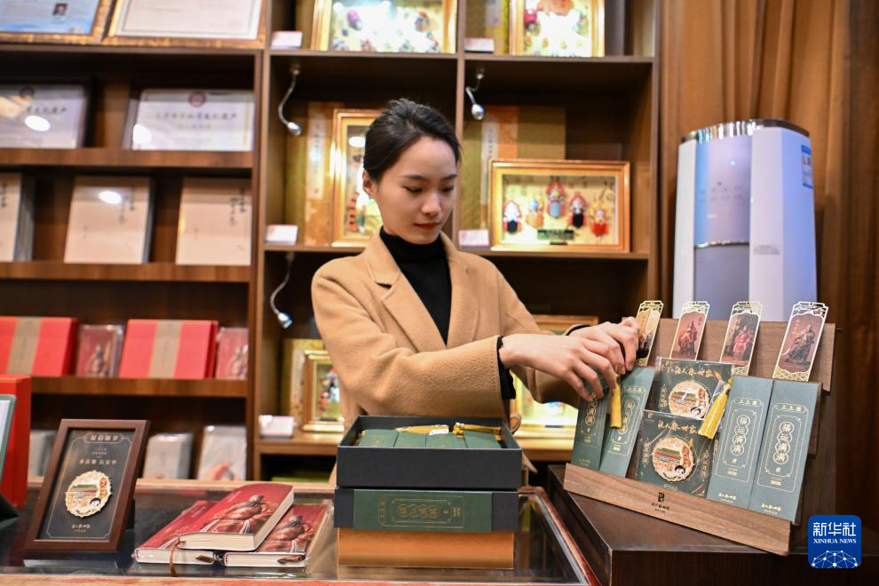 在(zai)天津古文化(hua)街(jie)泥人(ren)張(zhang)世家,銷售人(ren)員(yuan)在(zai)擺放文創產品(1月20日攝)。