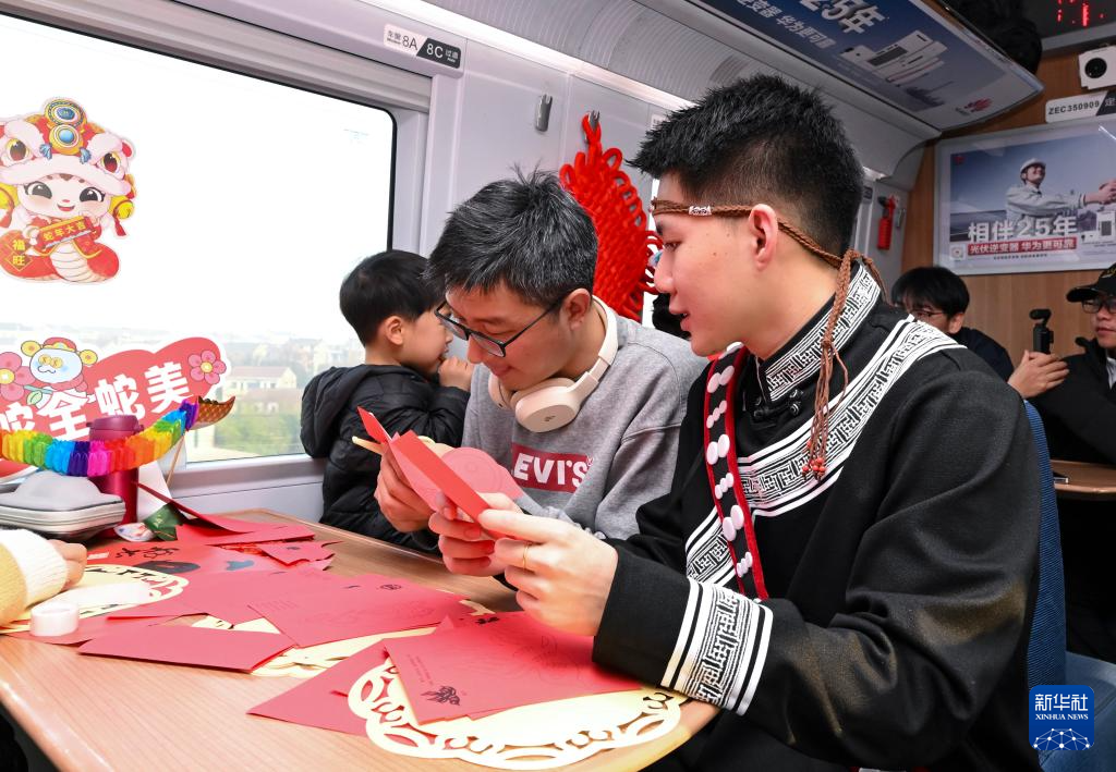1月21日,身著彝族服飾的鐵路上海客運段職(zhi)工鄭鑫(xin)(右)與旅客在車(che)廂里剪(jian)窗花。