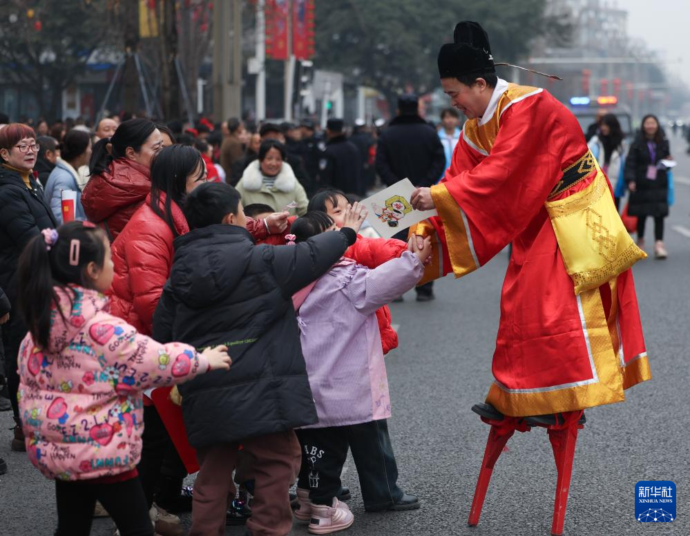 1月22日,在綿竹年畫(hua)節開幕(mu)式上,踩著高蹺的演員(yuan)與群眾互動。