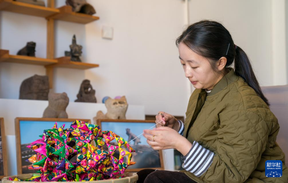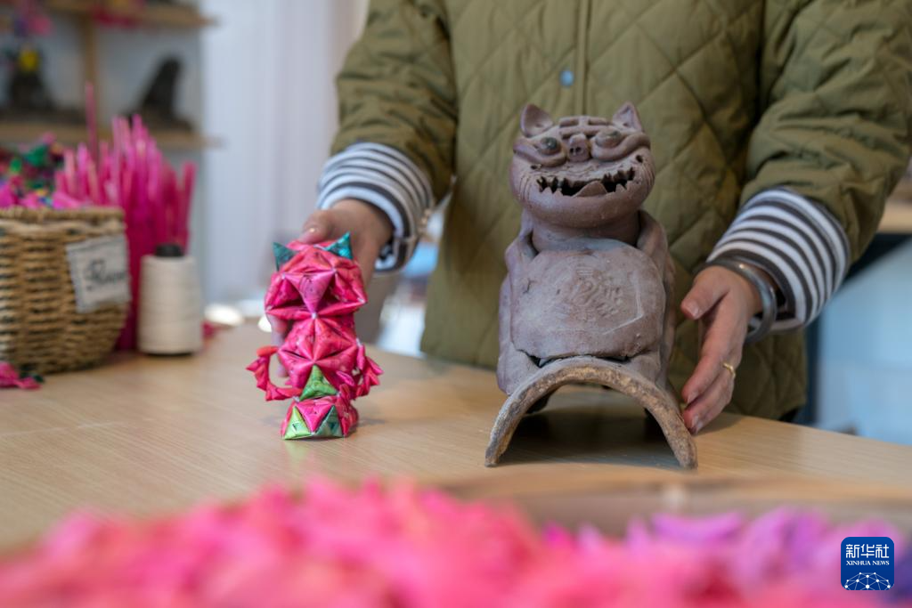 1月25日,楊潔在工作(zuo)室展(zhan)示一款造型為(wei)瓦(wa)貓的(de)菱角編制作(zuo)品。