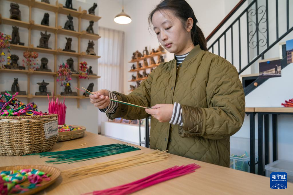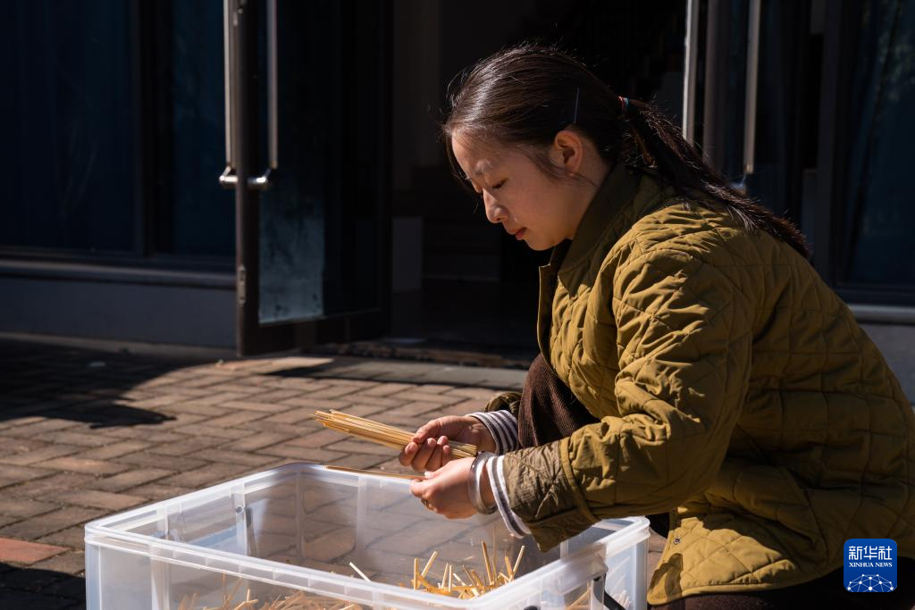 1月25日,楊潔在工(gong)作室(shi)分揀采集(ji)來的原色大麥(mai)稈。