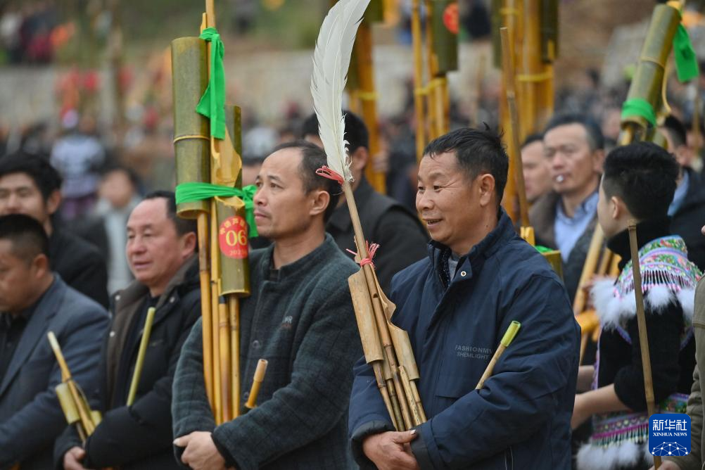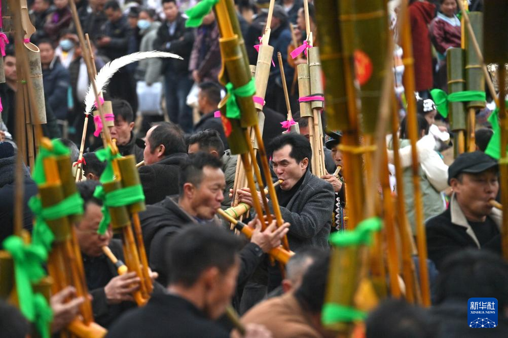 2月5日,人們在融水苗族自治(zhi)縣桿洞鄉百鳥衣蘆(lu)笙坡會上(shang)吹蘆(lu)笙。