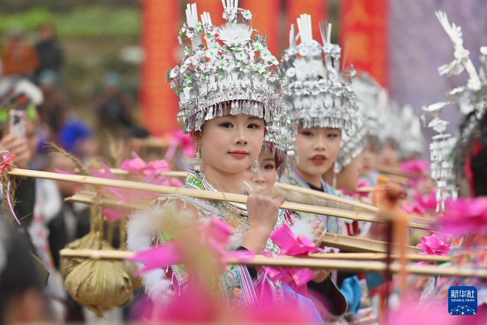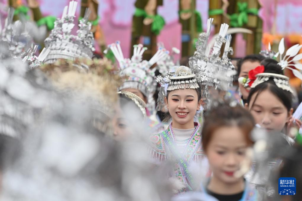 2月5日(ri),苗族(zu)姑娘(niang)在(zai)融水苗族(zu)自治縣桿洞鄉百鳥(niao)衣蘆笙(sheng)坡(po)會上進(jin)行民俗展演。
