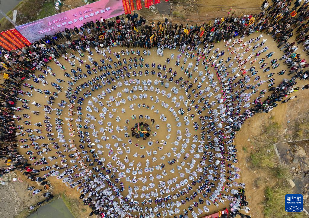 2月(yue)5日,在廣(guang)西融(rong)水苗族自治(zhi)縣(xian)桿洞鄉百鳥(niao)衣(yi)蘆笙(sheng)坡會上(shang),各族群(qun)眾一起跳蘆笙(sheng)踩堂舞(無人機(ji)照片)。
