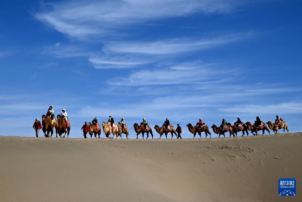 2月4日,游客(ke)在甘肅(su)省敦煌市(shi)鳴沙山月牙泉景區騎駱駝游覽。